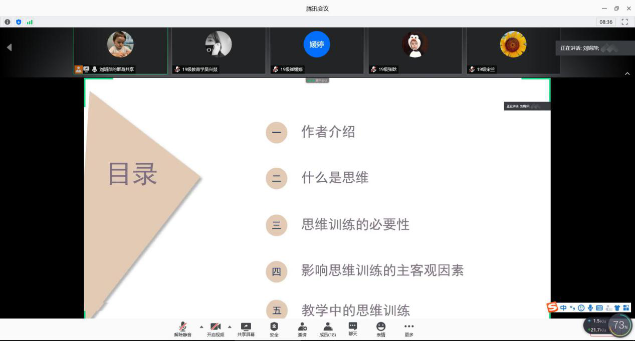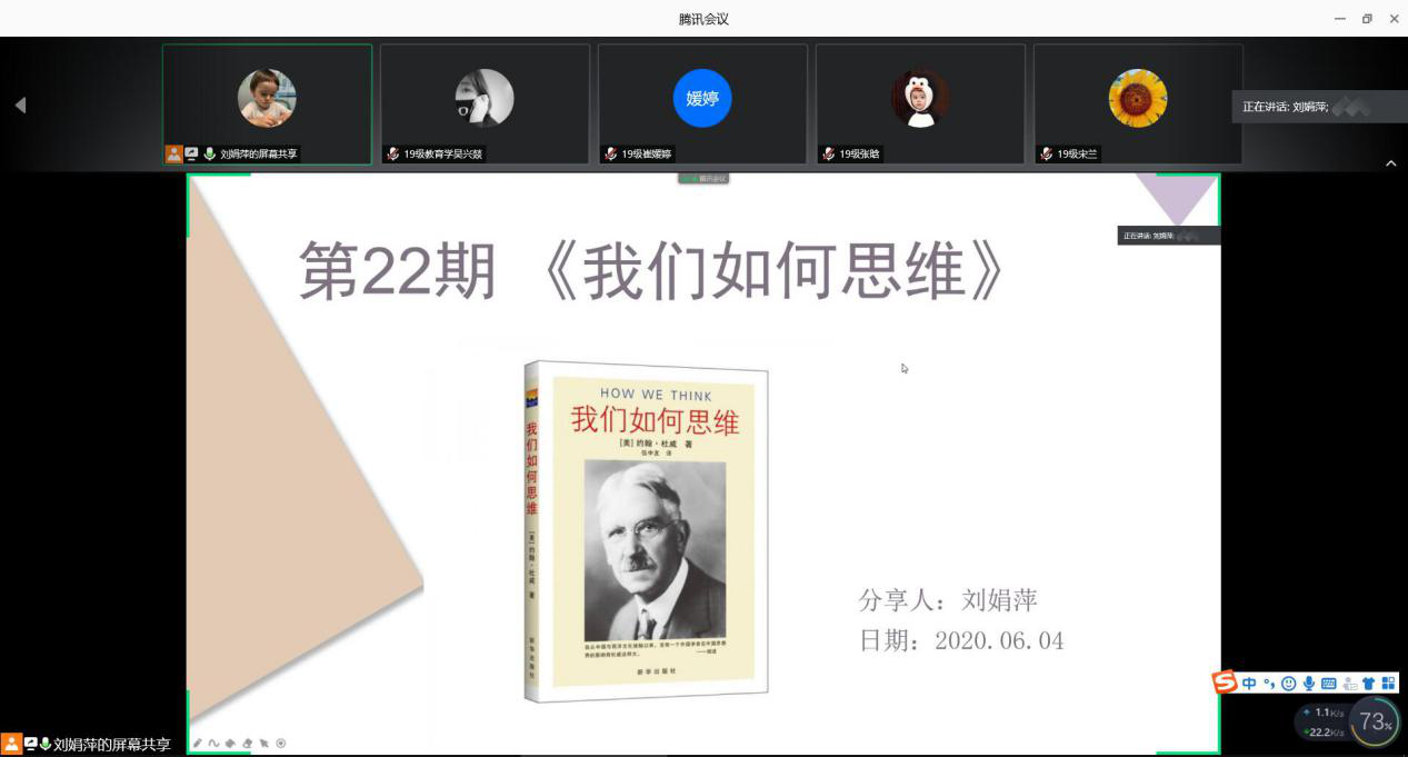 (图/文 吴兴燚)6月4日晚7点,三峡大学田家炳教育学院第22期“九思书会”在腾讯会议APP上如期举行,九思书会书友及我院部分研究生参加了本次读书会,我院张继平教授应邀参加。