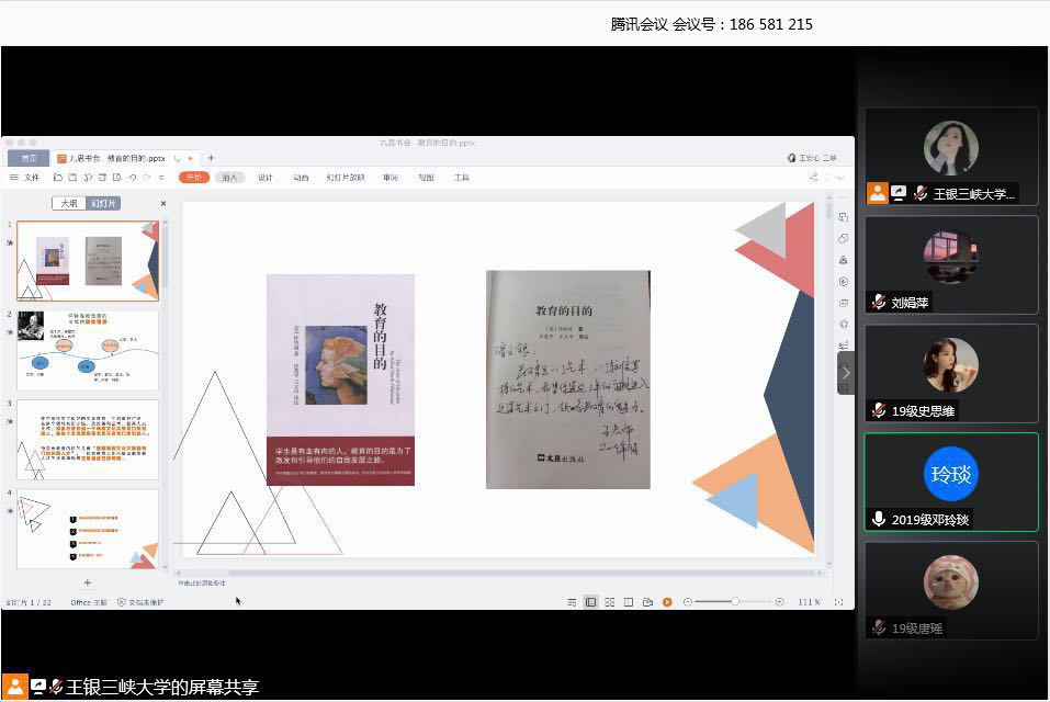 (文/王银)5月21日晚7点,田家炳教育学院第20期“九思书会”在腾讯会议APP上如期举行。本期读书会由我院2019级教育管理专业研究生王银主讲,九思书会书友、我院部分研究生及特邀嘉宾王重文博士参加了本次书会。