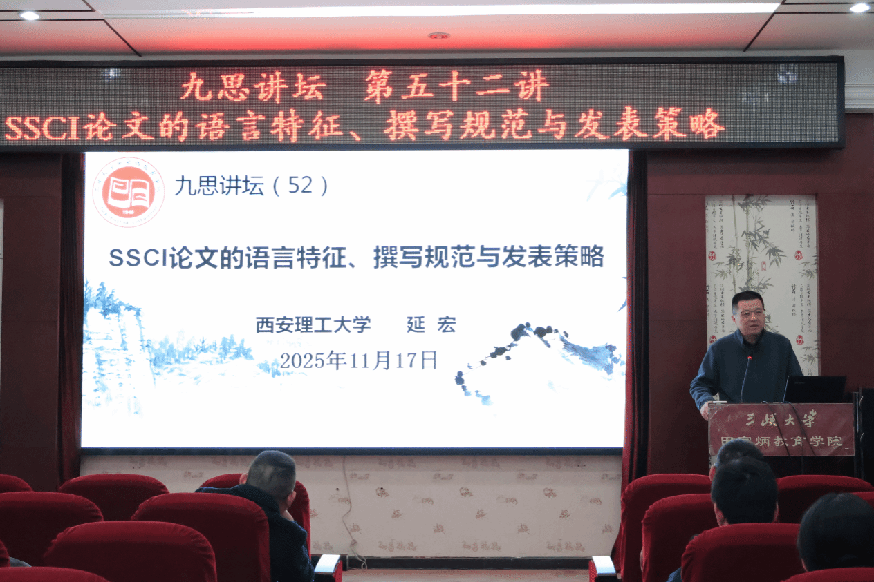 (文/陈晓莹 图/牟素月)11月17日下午,第五十二期九思讲坛在W1509举行。西安理工大学延宏教授应邀做客,为我院师生作了题为《SSCI论文的语言特征、撰写规范与发表策略》的学术报告。报告由学院院长赵军教授主持。