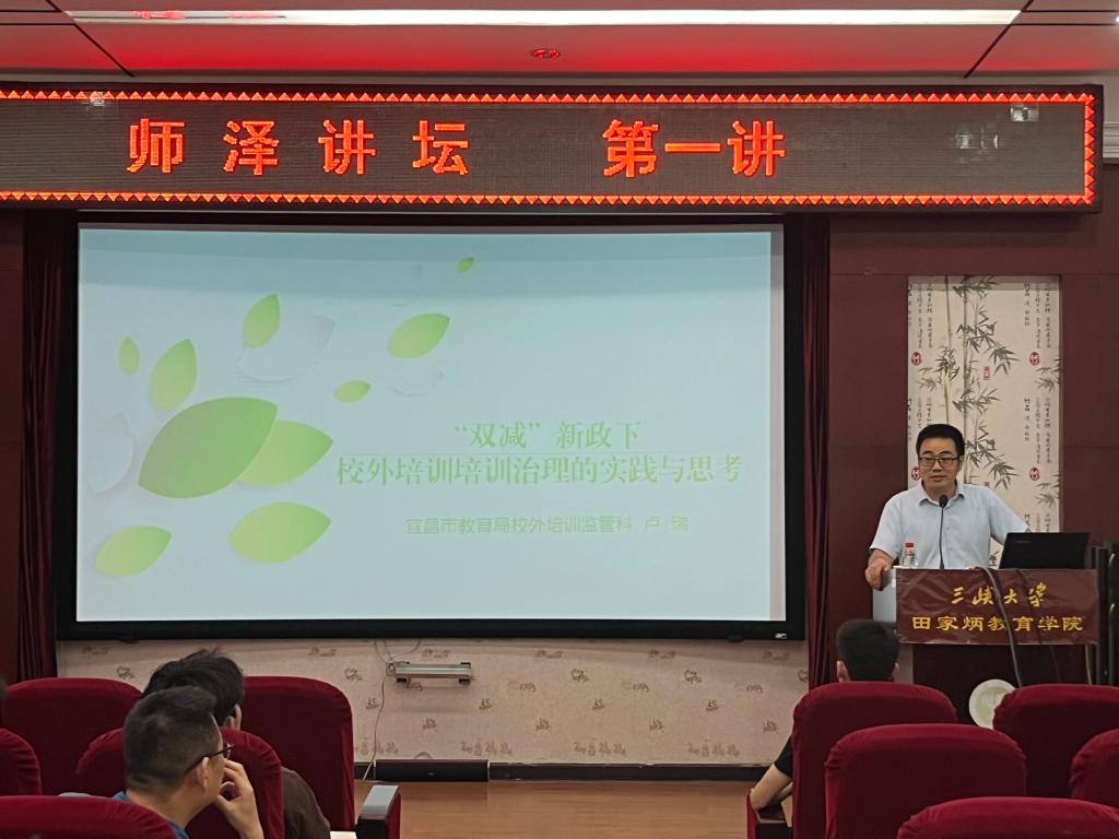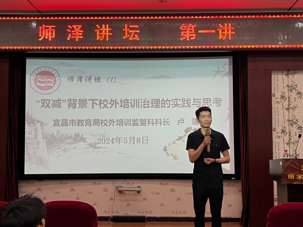 (文/图刘小娜审核/王重文)2024年5月8日上午,学院“师泽讲坛”第一讲在W1509举行,宜昌市教育局校外培训监管科科长卢瑞应邀作了《“双减”背景下校外培训治理的实践与思考》的学术报告。报告由王重文博士主持。