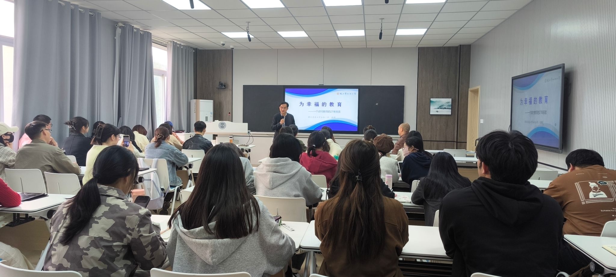 (文/李素芹、图/徐巧玲)11月12日下午,“师泽讲坛”第三讲在W3513开讲,枝江市仙女小学教育集团党支部书记、校长张鹏应邀做客,并为我院师生作了题为《为幸福的教育——一个农村教师的27年探索》的报告。报告由李素芹教授主持。